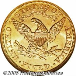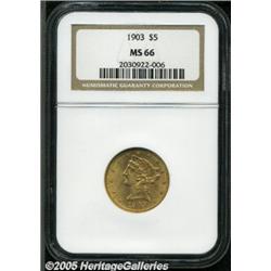 <B>1903 $5 MS66 NGC.</B></I> Smooth, virtually unblemished surfaces with soft, glowing, satiny luster and lovely orange-gold coloration. Slight softness on a few of the stars precludes a full strike label, but, aside from this, the strike is bold and the overall appearance is exceptional. Without question, one of the finest examples of this issue that this cataloger has seen. Population: 6 in 66, 2 finer (2/05).