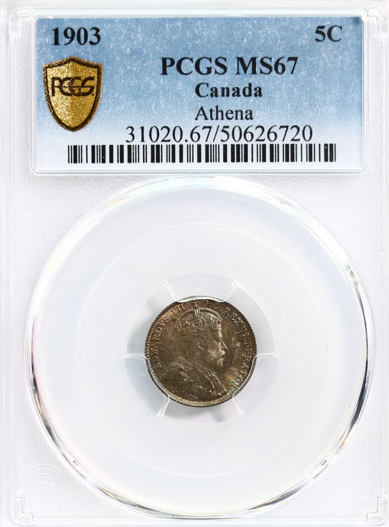 1903 5¢ PCGS Superb Gem Mint State-67. Wow! A stunning example with great eye appeal, great fields,