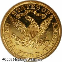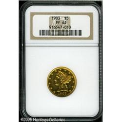 <B>1903 $5 PR63 NGC.</B></I> Only 154 proof Half Eagles were struck in 1903 and we estimate that today somewhere between 55 and 70 pieces survive. This is a very nice proof. Struck in the no-contrast style used by the mint in the early years of this century, the devices are as brilliant and dazzling as the fields are. We can find no evidence of actual cleaning on either side, just a few wispy hairlines from careless handling. A small squiggly lint mark is noted (for pedigree purposes) below and to the left of the 1 in the date. An exceptionally intense and vibrant coin, this piece represents excellent value in a Select proof Half Eagle. Lot:8671