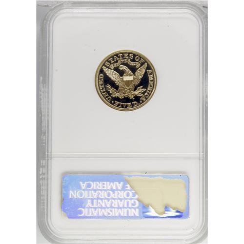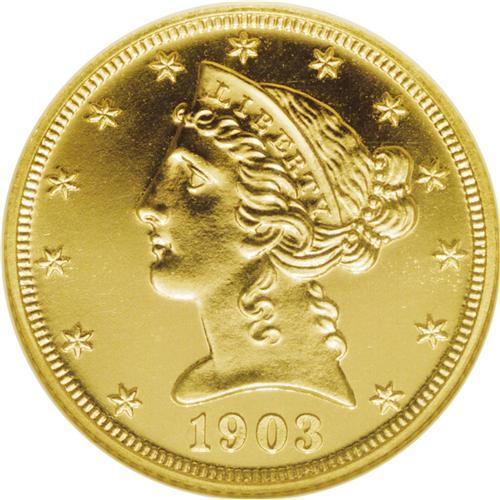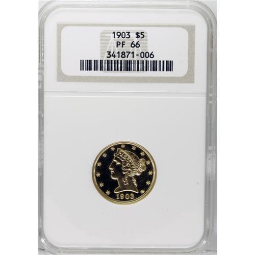 <B>1903 $5 PR66 NGC.</B></I> In 1902 the Mint switched from the former proof format that featured brilliantly mirrored fields and deeply frosted cameo devices to an all-brilliant format. The 1903 half eagle accordingly is not found with the deep cameo contrast of the issues from 1901 and before. The 1903 is one of the most common Liberty Head proof half eagles, but any proof issue as a type is still quite rare. The surfaces on each side are a gorgeous canary-yellow, brilliantly mirrored, as expected, and uncommonly free of distractions, even for a well-preserved proof. Bold and beautiful! Census: 2 in 66, 1 finer (11/06).<BR><BR><b>Shipping:</b> Coin/Currency (<a target="_blank" href="http://www.heritageauctions.com/common/shipping.php">view shipping information</a>)