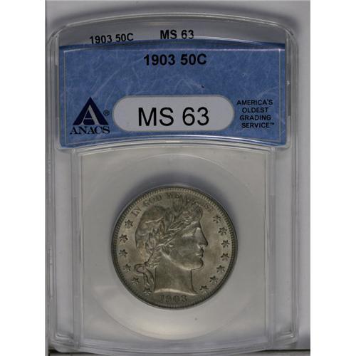 <B>1903<50C> MS63 ANACS.</B></I> Low to medium intensity golden-gray patination displays light blue accents on the obverse. Sharply impressed throughout, with soft luster and a few minute marks on Liberty's cheek.