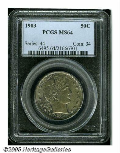 <B>1903<50C> MS64 PCGS.</B></I> Satiny surfaces are covered in dove-gray patina, with steel-blue and lilac accents peeking out from the devices. A few wispy pinscratches on Liberty's neck rule out a higher classification. Population: 20 in 64, 6 finer (6/05).