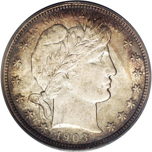 <B>1903 50C MS64 PCGS.</B></I> Sharply struck with satiny luster beneath deep ivory and golden-brown color. The fields exhibit some reflectivity that adds to the overall eye appeal of this specimen. On the reverse, the borders have delightful iridescent toning. Only a few finer examples of this date have been certified by PCGS. Population: 24 in 64, 6 finer (12/05).