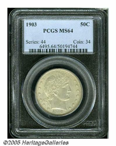 <B>1903<50C> MS64 PCGS.</B></I> While the production numbers were generous with 2.27 million halves produced, this is a surprisingly scarce issue in MS64 condition, as is attested to by the population figures. PCGS has graded only 20 near Gems and six finer, while NGC has seen only eight MS64s and four finer (6/05). This example is well struck, except for the upper right (facing) corner of the shield. The lustrous surfaces exhibit light gray patina, and a couple of grade-limiting marks on Liberty's cheek.