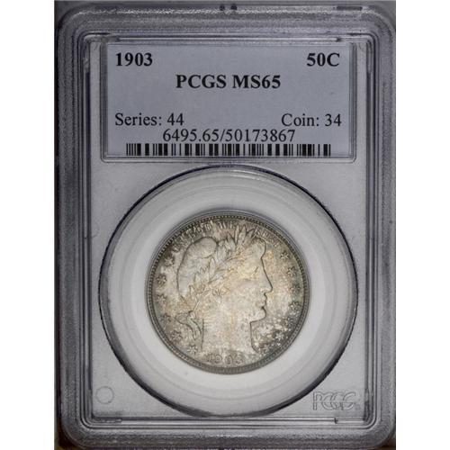 <B>1903<50C> MS65 PCGS.</B></I> The casual collector would never suspect that a 20th century P-mint issue with a mintage of nearly 2.3 million pieces would be next to impossible to locate as a Gem, but here is such a creature. The frosty originality of this uncommonly high grade example is obvious beneath speckled golden and olive-gray toning. The strike is bold; just a few pinpoint facial disturbances preclude an even finer grade. Population: 2 in 65, 4 finer (3/06). <BR><BR><B>Important notice:</B> Heritage usually auctions material at the rate of 200-250 lots per hour. On some occasions eBay Live bid software or the Internet may not be able to keep up with the pace of the auction. We recommend placing a realistic absentee bid now as insurance to avoid disappointment. Occasionally the auctioneer may eliminate or reject an eBay Live bid, and the auctioneer may also reopen a lot after the close of the eBay live bidding (usually because we missed an audience bid), and may reject your bid even if it shows you as the winning bidder. By bidding via eBay Live, you agree that Heritage may award the lot to another bidder at its sole discretion under the circumstances described above or any other reasonable circumstances. Since eBay bids are not shown to us until we open the lot on the floor, we treat those bids just like floor bids. In most cases the floor responds before the eBay bid is presented to us, due to Internet lag time, so for consistency we have made it a policy that floor bids are always considered first over tie eBay live bids. Also please note that all Heritage lots purchased through eBay Live carry a 20% Buyer's Premium. Please make sure you read the Terms and Conditions before you bid. This lot is being auctioned in conjunction with a live floor auction by Heritage Galleries & Auctioneers. All final auction and invoice information will be supplied by Heritage Galleries & Auctioneers, and all other information should be considered preliminary. Lot:2056 <BR><BR><B>Winning Notification and Billing:</B> After the FINAL session in this auction is complete, Heritage will send e-mail and snail mail invoices. This process normally takes several days. All final auction and invoice information will be supplied by Heritage Galleries & Auctioneers, and all other information should be considered preliminary. <BR><BR>This auction will be conducted on a live auction floor and over the Internet through eBay Live. If you choose to place an absentee bid, please take a moment to <font color='#0000ff'><u><a href='http://pages.ebay.com/liveauctions/help/before/laabsentee.html'>learn how eBay Live absentee bidding works</a></u></font><font color='#000000'>