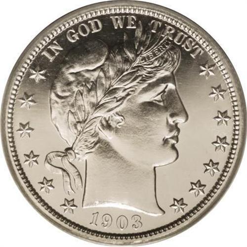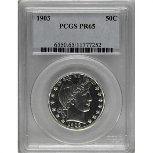 <B>1903 50C PR65 PCGS.</B></I> A sparkling, intensely mirrored Gem that is fully brilliant (what others might refer to as "stone-white") and possesses impeccable, hairline-free fields. Only a few glancing slidemarks on Liberty's cheek, nearly imperceptible without a glass and a good light source, keep this impressive proof from an even higher technical rating. Population: 25 in 65, 22 finer (6/07).<BR><BR><B>Coin Engraver:</B> Charles E. Barber<BR><BR><b>Shipping:</b> Coins & Currency (<a target="_blank" href="http://www.heritageauctions.com/common/shipping.php">view shipping information</a>\)