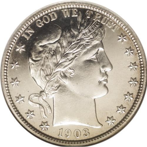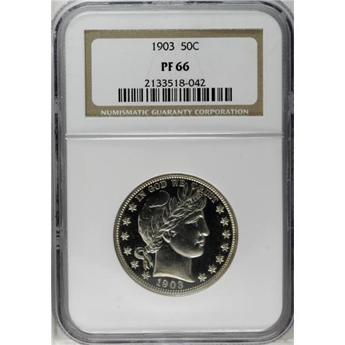 <B>1903<50C> PR66 NGC.</B></I> A deeply mirrored specimen that is mostly brilliant with just a hint of pastel-golden color, and dazzles the viewer with its almost perfectly preserved surfaces and subtle contrast. From a mintage of 755 proofs, surely among the top ten percent of pieces extant. Census: 39 in 66, 19 finer (6/06).<BR><I>From The Mulholland Collection.</B></I>