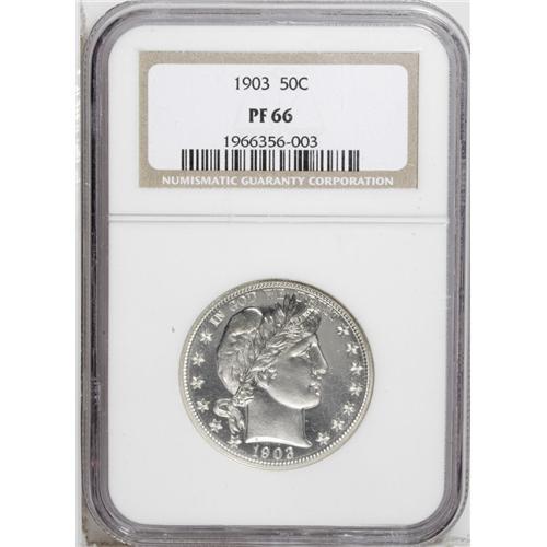 <B>1903<50C> PR66 NGC.</B></I> Both sides are brilliant throughout and display illimitable depth of glassy reflectivity. A hint of contrast is picked up primarily on the reverse, although not quite enough to warrant a cameo designation. Easily among the top 20% of survivors from a proof mintage of just 755 pieces. Census: 39 in 66, 19 finer (8/06).