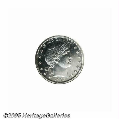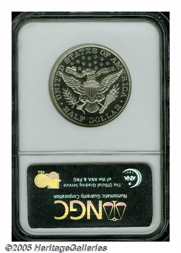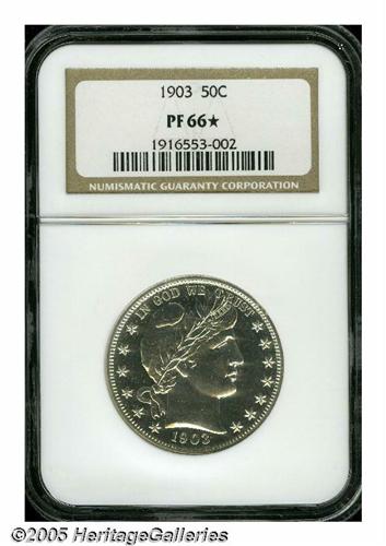 <B>1903<50C> PR66 <S NGC.</B></I> This is a delightful Proof with excellent eye appeal. Very light contrast is visible between the fields and devices and the surfaces are brilliant-white overall. This is one of the finer Proof Barber Half Dollars available on the market, a sure winner for the connoisseur.