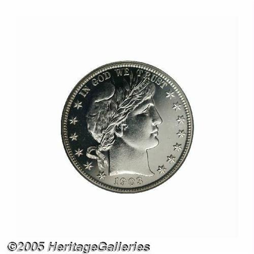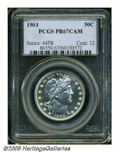 <B>1903<50C> PR67 Cameo PCGS.</B></I> Pleasing white on black contrast ensures the eye appeal of this brilliant and unmarked Superb Gem. Fully struck on the right (facing) claw and fletchings, the right shield corner has only a trace of softness, unlike often seen on this strike challenged type. A scant 755 pieces were issued. PCGS has not certified any examples of this date as Deep Cameo. Population: 3 in 67 Cameo, none finer at either service (6/05).