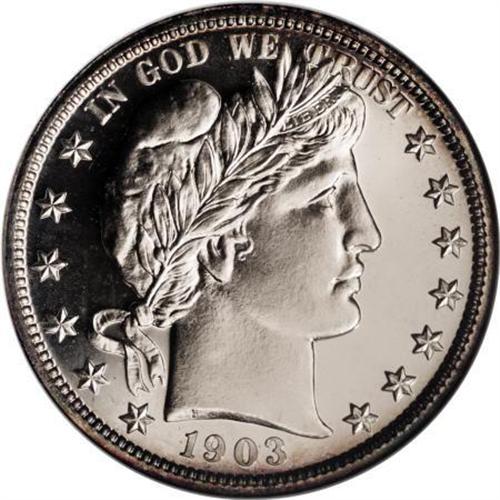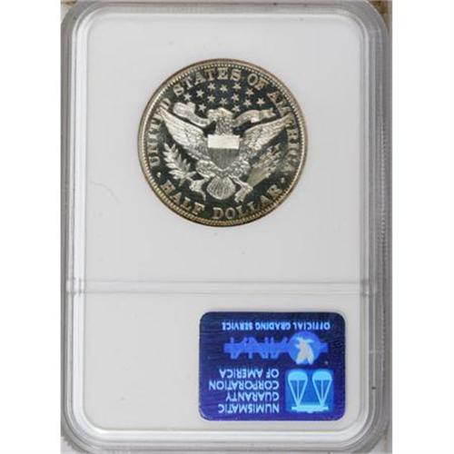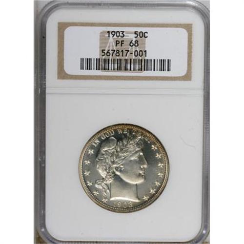 <B>1903 50C PR68 NGC.</B></I> Though the Barber design proved unpopular with contemporary numismatists, enough collectors purchased proof sets that specimens in typical grades are available and comparably affordable today. An extraordinary survivor such as the present piece, however, is another story. While the obverse shows the lack of contrast that marks most of the early 20th century silver proof issues, the reverse offers a modicum of contrast. Wisps of gold and champagne patina grace the margins, while the centers are essentially untoned. Even under magnification, the minuscule flaws that preclude a perfect grade are difficult to see. Of the 755 specimens struck, this wonderful example ranks among the finest; neither NGC nor PCGS has certified a numerically finer representative, with just seven pieces awarded a grade of MS68 between both services (8/07).<BR><BR><B>Coin Engraver:</B> Charles E. Barber<BR><BR><b>Shipping:</b> Coins & Currency (<a target="_blank" href="http://www.heritageauctions.com/common/shipping.php">view shipping information</a>)