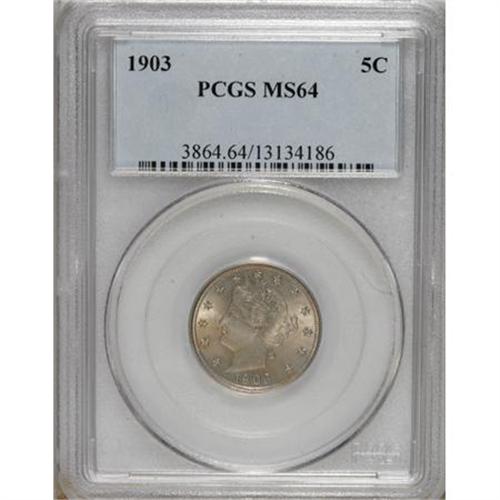 <B>1903 5C MS64 PCGS.</B></I> PCGS Population (336/231). NGC Census: (228/210). Mintage: 28,006,724. Numismedia Wsl. Price for NGC/PCGS coin in MS64: $180. (#3864)<BR><BR><b>Shipping:</b> Coins & Currency (<a target="_blank" href="http://www.heritageauctions.com/common/shipping.php">view shipping information</a>)