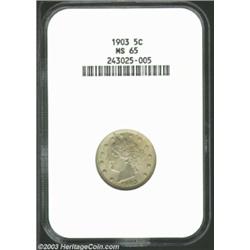 <TABLE cellSpacing=0 cellPadding=0 width="100%" bgColor=#000000 border=0><TBODY><TR><TD width="100%"><TABLE cellSpacing=1 cellPadding=3 width="100%" border=0><TBODY><TR><TD width="100%" bgColor=#79735c><FONT face=arial color=#ffffff size=3><B>Description</B> </FONT></TD></TR><TR><TD width="100%" bgColor=#ffffff><FONT face=arial size=2><B>1903 5C MS65 NGC.</B></I> Boldly struck and showing only the most minor flaws upon inspection with a loupe. The toning that is displayed is of an even olive-gray color and doesn't distract from the eye appeal in the slightest. </FONT></TD></TR></TBODY></TABLE></TD></TR></TBODY></TABLE><BR><A name=PricesRealized></A><TABLE cellSpacing=0 cellPadding=0 width="100%" bgColor=#000000 border=0><TBODY><TR><TD width="100%"><TABLE cellSpacing=1 cellPadding=3 width="100%" border=0><TBODY><TR><TD width="100%" bgColor=#79735c><A name=PR><FONT face=arial color=#ffffff size=3><B>Previous Prices from Heritage Auctions</B> </FONT></A></TD></TR><TR><TD bgColor=#f6f6ed><TABLE cellSpacing=0 cellPadding=0 width="100%" border=1><TBODY><TR><TD align=middle width="33%"><B>Date</B></TD><TD align=middle width="33%"><B>Service</B></TD><TD align=middle width="33%"><B>Price</B></TD></TR><TR bgColor=whitesmoke><TD width="33%"><B>02/25/2003</B></TD><TD width="33%">PCGS</TD><TD width="33%">$403.65</TD></TR><TR bgColor=whitesmoke><TD width="33%"><B>05/15/2001</B></TD><TD width="33%">PCGS</TD><TD width="33%">$370.00</TD></TR><TR bgColor=whitesmoke><TD width="33%"><B>12/09/1994</B></TD><TD width="33%">NGC</TD><TD width="33%">$291.50</TD></TR><TR bgColor=whitesmoke><TD width="33%"><B>01/06/1993</B></TD><TD width="33%">PCGS</TD><TD width="33%">$495.00</TD></TR><TR bgColor=whitesmoke><TD width="33%"><B>11/15/2001</B></TD><TD width="33%">NGC</TD><TD width="33%">$431.25</TD></TR><TR bgColor=whitesmoke><TD width="33%"><B>02/03/1993</B></TD><TD width="33%">NGC</TD><TD width="33%">$220.00</TD></TR><TR bgColor=whitesmoke><TD width="33%"><B>07/29/2003</B></TD><TD width="33%">PCGS</TD><TD width="33%">$471.50</TD></TR><TR bgColor=whitesmoke><TD width="33%"><B>03/02/1995</B></TD><TD width="33%">NGC</TD><TD width="33%">$220.00</TD></TR><TR bgColor=whitesmoke><TD width="33%"><B>07/29/2003</B></TD><TD width="33%">NGC</TD><TD width="33%">$379.50</TD></TR></TBODY></TABLE></TD></TR><TR><TD bgColor=#ffffff><FONT face=arial size=1 ?>PLEASE NOTE: All prices realized reflect the final hammer price PLUS the buyer's premium in auctions that charge a buyer's premium. Each item has a notation at the top of the listing indicating whether that lot included a buyer's premium. Example: A item that sells with a final hammer price of $100 and a 20% buyer's premium will display with a price realized of $120. All information listed is intended to be as accurate as possible, but errors are possible. Please use this guide carefully and inform us of any inaccuracies. </FONT></TD></TR></TBODY></TABLE></TD></TR></TBODY></TABLE><BR><TABLE cellSpacing=0 cellPadding=0 width="100%" bgColor=#000000 border=0><TBODY><TR><TD width="100%"><TABLE cellSpacing=1 cellPadding=3 width="100%" border=0><TBODY><TR><TD width="100%" bgColor=#79735c colSpan=6><FONT face=arial color=#ffffff size=3><B>Price Guide*</B> </FONT></TD></TR><TR bgColor=#f6f6ed><TD align=middle><B>Grade</B> </TD><TD align=middle><B>Coin World<BR>(Trends)</B> </TD><TD align=middle><B>Numismedia<BR>Retail</B> </TD><TD align=middle><B>Numismedia<BR>Wholesale</B> </TD><TD align=middle><B>Coin<BR>Universe</B> </TD><TD align=middle><B>Heritage<BR>Value Index</B> </TD></TR><TR bgColor=#ffffff><TD align=middle>64</TD><TD align=right>$180.00</TD><TD align=right>$205.00</TD><TD align=right>$164.00</TD><TD align=right>$185.00</TD><TD align=right>$132.38</TD></TR><TR style="FONT-WEIGHT: bold" bgColor=#cccfdd><TD align=middle>65</TD><TD align=right>$525.00</TD><TD align=right>$540.00</TD><TD align=right>$432.00</TD><TD align=right>$750.00</TD><TD align=right>$401.25</TD></TR><TR bgColor=#ffffff><TD align=middle>66</TD><TD align=right>$1,200.00</TD><TD align=right>---</TD><TD align=right>$900.00</TD><TD align=right>$1,950.00</TD><TD align=right>$1,101.67</TD></TR><TR bgColor=#ffffff><TD colSpan=6><FONT size=1>*All information listed is intended to be as accurate as possible, but errors are possible. No item may be returned or refused based on this information which is provided as a service to our customers. You should contact each pricing source directly to determine the accuracy of this information. </FONT></TD></TR></TBODY></TABLE></TD></TR></TBODY></TABLE><BR><TABLE cellSpacing=0 cellPadding=0 width="100%" bgColor=#000000 border=0><TBODY><TR><TD width="100%"><TABLE cellSpacing=1 cellPadding=3 width="100%" border=0><TBODY><TR><TD width="100%" bgColor=#79735c><FONT face=arial color=#ffffff size=3><B>Population Guide</B> </FONT></TD></TR><TR bgColor=#ffffff><TD align=middle><!-- Begin Output of Population Grid--><TABLE cellSpacing=0 cellPadding=0 width="100%" border=0><TBODY><TR><TD vAlign=center><TABLE cellSpacing=0 width="100%" border=1 cellsadding="3"><TBODY><TR><TD vAlign=center><TABLE cellSpacing=0 cellPadding=3 width="100%" border=1><TBODY><TR><TD vAlign=center align=middle bgColor=#f0f1e8 colSpan=2 <CENTER><FONT face=Arial size=2><B>PCGS Pop </B></FONT><CENTER></CENTER></TD><TD vAlign=center align=middle bgColor=#f0f1e8 colSpan=2><CENTER><FONT face=Arial size=2><B>NGC Pop</B></CENTER></FONT></TD></TR><TR><TD vAlign=center><FONT face=Arial size=2>(65)</FONT> </TD><TD vAlign=center align=right><FONT face=Arial size=2>129</FONT> </TD><TD vAlign=center><FONT face=Arial size=2>(65)</FONT> </TD><TD vAlign=center align=right><FONT face=Arial size=2>134</FONT> </TD></TR><TR><TD vAlign=center><FONT face=Arial size=2>(>65)</FONT> </TD><TD vAlign=center align=right><FONT face=Arial size=2>45</FONT> </TD><TD vAlign=center><FONT face=Arial size=2>(>65)</FONT> </TD><TD vAlign=center align=right><FONT face=Arial size=2>58</FONT> </TD></TR></TBODY></TABLE></TD></TR></TBODY></TABLE></TD></TR></TBO