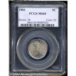 <table><tr><td><table><tr><td>1903 5C MS65 PCGS. A well toned piece with bright rose, amber and sky-blue tones. A well struck and problem-free Gem coin. <BR><BR><B>Important notice:</B> Heritage usually auctions material at the rate of 200-250 lots per hour. On some occasions eBay Live bid software or the Internet may not be able to keep up with the pace of the auction. We recommend placing a realistic absentee bid now as insurance to avoid disappointment. Occasionally the auctioneer may eliminate or reject an eBay Live bid, and the auctioneer may also reopen a lot after the close of the eBay live bidding (usually because we missed an audience bid), and may reject your bid even if it shows you as the winning bidder. By bidding via eBay Live, you agree that Heritage may award the lot to another bidder at its sole discretion under the circumstances described above or any other reasonable circumstances. Since eBay bids are not shown to us until we open the lot on the floor, we treat those bids just like floor bids. In most cases the floor responds before the eBay bid is presented to us, due to Internet lag time, so for consistency we have made it a policy that floor bids are always considered first over tie eBay live bids. Also please note that all Heritage lots purchased through eBay Live carry a 20% Buyer's Premium. Please make sure you read the Terms and Conditions before you bid. <BR><BR><B>IMPORTANT ANNOUNCEMENT ABOUT RESERVES:</B> Heritage now divulges all reserves on its web site 7 days before every auction. If you want to know whether the reserve on this lot has been met, and if not, what the reserve amount is, please visit this lot page on the HeritageCoin.com web site, or email: bid@HeritageGalleries.com </span></font></td></tr></table></td></tr></table>