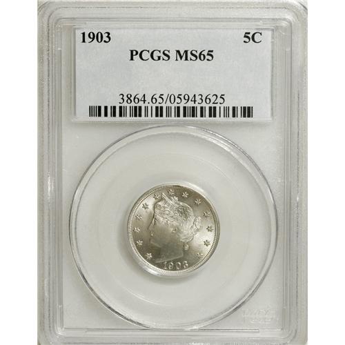 1903 5C MS65 PCGS. The obverse is silver-gray with a h