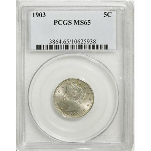 <B>1903 5C MS65 PCGS.</B></I> PCGS Population (160/71). NGC Census: (154/56). Mintage: 28,006,724. Numismedia Wsl. Price for NGC/PCGS coin in MS65: $575. (#3864)<BR><BR><B>Coin Engraver:</B> Charles E. Barber<BR><BR><b>Shipping:</b> Coins & Currency (<a target="_blank" href="http://www.heritageauctions.com/common/shipping.php">view shipping information</a>\)