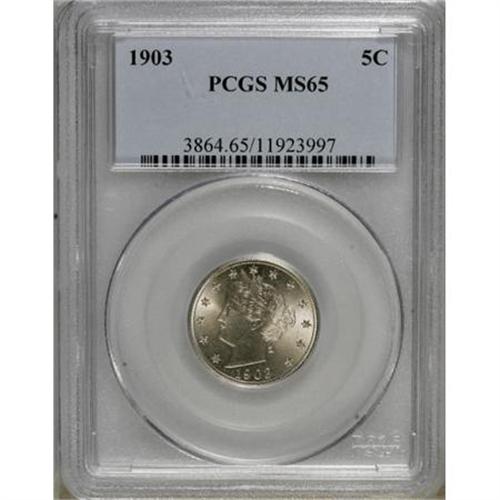 <B>1903 5C MS65 PCGS.</B></I> PCGS Population (184/84). NGC Census: (157/57). Mintage: 28,006,724. Numismedia Wsl. Price for NGC/PCGS coin in MS65: $575. (#3864)<BR><BR><B>Coin Engraver:</B> Charles E. Barber<BR><BR><b>Shipping:</b> Coins & Currency (<a target="_blank" href="http://www.heritageauctions.com/common/shipping.php">view shipping information</a>)
