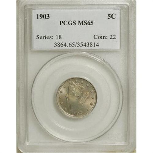 <B>1903 5C MS65 PCGS.</B></I> PCGS Population (184/84). NGC Census: (157/57). Mintage: 28,006,724. Numismedia Wsl. Price for NGC/PCGS coin in MS65: $575. (#3864)<BR><BR><B>Coin Engraver:</B> Charles E. Barber<BR><BR><b>Shipping:</b> Coins & Currency (<a target="_blank" href="http://www.heritageauctions.com/common/shipping.php">view shipping information</a>)
