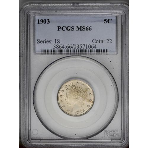 "1903 5C MS66 PCGS. A bold striking, sav"