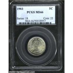 1903 5C MS66 PCGS. Boldly struck with a bright silvery finish interrupted by a few light blushes of.