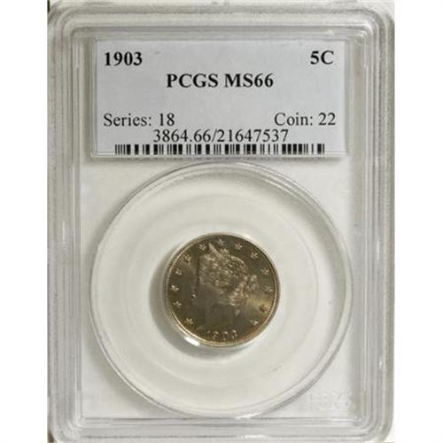 <B>1903 5C MS66 PCGS.</B></I> This impressive Premium Gem Liberty nickel displays scintillating luster and light olive-gold toning across each side. Softly struck on the first two obverse stars, and on the reverse left ear of corn; the remaining design elements are crisply produced. Population: 81 in 66, 2 finer (8/07). <BR><BR><B>Coin Engraver:</B> Charles E. Barber<BR><BR><b>Shipping:</b> Coins & Currency (<a target="_blank" href="http://www.heritageauctions.com/common/shipping.php">view shipping information</a>)