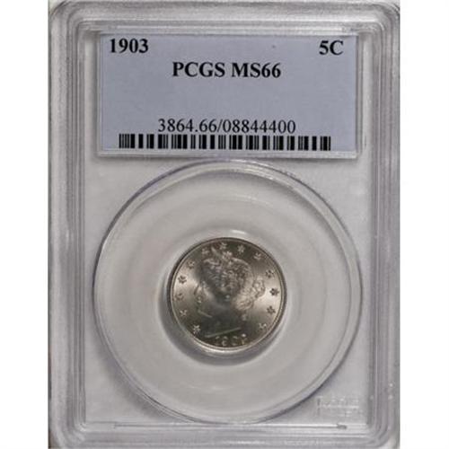 <B>1903 5C MS66 PCGS.</B></I> Excellent definition overall with just a touch of softness at the obverse stars. Subtle mint and nickel-gray shadings converge on the satiny and surprisingly well-preserved surfaces. PCGS has graded just two finer pieces (11/07).<BR><BR><B>Coin Engraver:</B> Charles E. Barber<BR><BR><b>Shipping:</b> Coins & Currency (<a target="_blank" href="http://www.heritageauctions.com/common/shipping.php">view shipping information</a>)