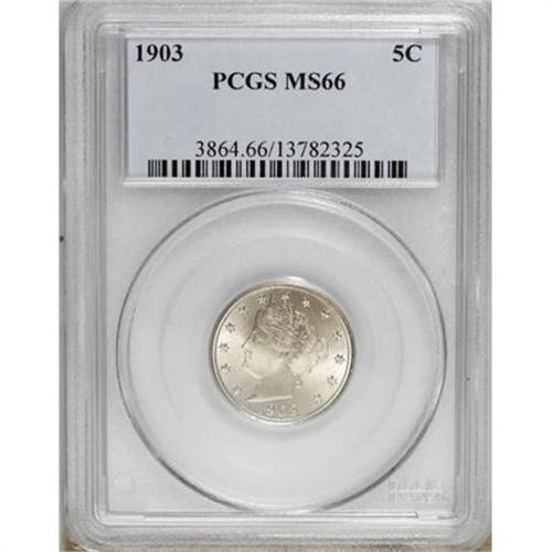 <B>1903 5C MS66 PCGS. CAC.</B></I> Light golden toning graces each side of this thoroughly lustrous Premium Gem. Carefully preserved with excellent overall definition for this early 20th century issue.<BR><BR><B>Coin Engraver:</B> Charles E. Barber<BR><BR><b>Shipping:</b> Coins & Currency (<a target="_blank" href="http://www.heritageauctions.com/common/shipping.php">view shipping information</a>)