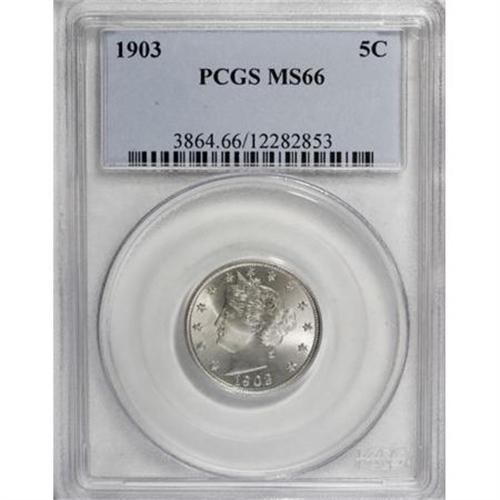 <B>1903 5C MS66 PCGS.</B></I> Fully brilliant and frosty gray enhanced by hints of champagne toning. Sharply detailed, with pristine surfaces; a highly appealing Premium Gem, seldom found any nicer. Population: 83 in 66, 2 finer (12/07).<BR><BR><B>Coin Engraver:</B> Charles E. Barber<BR><BR><b>Shipping:</b> Coins & Currency (<a target="_blank" href="http://www.heritageauctions.com/common/shipping.php">view shipping information</a>)