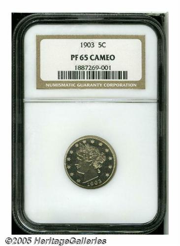 <B>1903<5C> PR65 Cameo NGC.</B></I> The brilliant surfaces are deeply reflective in the fields with sharply contrasting mint frost over the devices. A well-balanced coin that shows no obvious defects. Population: 5 in 65, 18 finer (5/05).