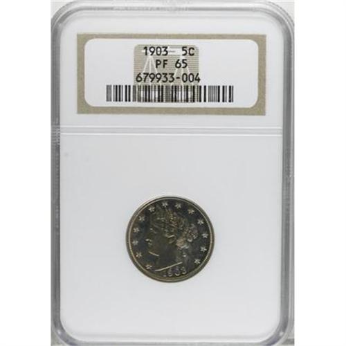 <B>1903 5C PR65 NGC.</B></I> NGC Census: (111/125). PCGS Population (132/78). Mintage: 1,790. Numismedia Wsl. Price for NGC/PCGS coin in PR65: $492. (#3901)<BR><BR><B>Coin Engraver:</B> Charles E. Barber<BR><BR><b>Shipping:</b> Coins & Currency (<a target="_blank" href="http://www.heritageauctions.com/common/shipping.php">view shipping information</a>)