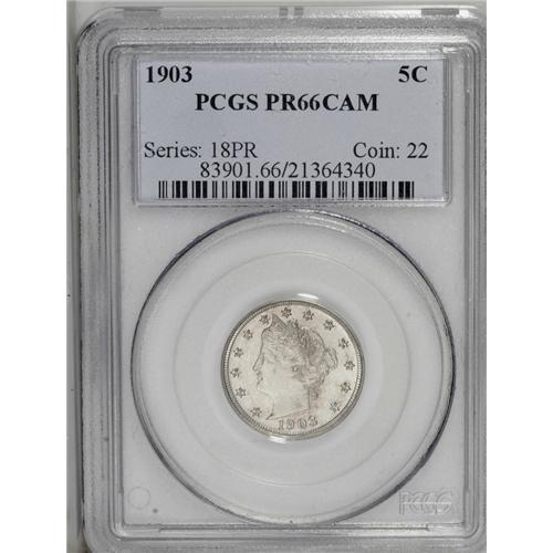 <B>1903<5C> PR66 Cameo PCGS.</B></I> A meticulously struck Premium Gem with good contrast between the deeply mirrored fields and the lightly toned devices. A lovely specimen. Population: 20 in 66 Cameo, 7 finer (7/06).<BR><I>From The Troy Wiseman Collection.</B></I>