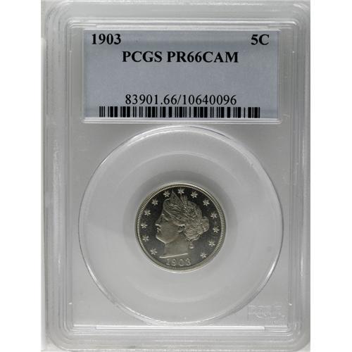 <B>1903<5C> PR66 Cameo PCGS.</B></I> Crisply struck with a light coating of milky color on both sides, and dynamically reflective fields that provide an ideal backdrop for noteworthy cameo contrast with richly frosted devices. Well preserved and free of troublesome hairlines or bothersome contact marks. Population: 20 in 66 Cameo, 7 finer (6/06).