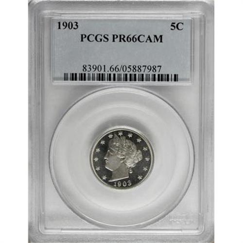 <B>1903 5C PR66 Cameo PCGS.</B></I> A gleaming piece that shows remarkable reflectivity and distinct contrast, a welcome change from the brilliance that appears on most examples. Minimally toned save for a touch of champagne at the lower reverse. Population: 25 in 66 Cameo, 7 finer (12/07).<BR><BR><b>Shipping:</b> Coins & Currency (<a target="_blank" href="http://www.heritageauctions.com/common/shipping.php">view shipping information</a>)