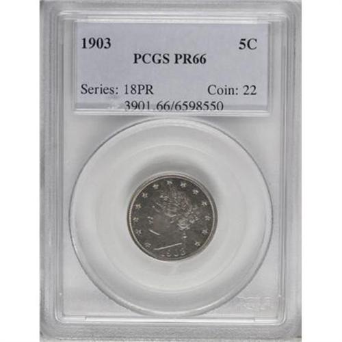 <B>1903 5C PR66 PCGS.</B></I> Baby-blue and canary-yellow shadings mingle over the shining mirrors of this attentively struck proof Liberty nickel. Uncommonly appealing for its comparatively low-mintage issue. Population: 60 in 66, 23 finer (1/08).<BR><BR><B>Coin Engraver:</B> Charles E. Barber<BR><BR><b>Shipping:</b> Coins & Currency (<a target="_blank" href="http://www.heritageauctions.com/common/shipping.php">view shipping information</a>)