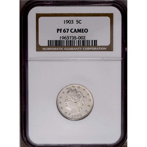 <B>1903<5C> PR67 Cameo NGC.</B></I> Both sides of this Superb Gem have brilliant light gray surfaces with deeply mirrored fields and highly lustrous devices. This is an extremely important opportunity to acquire an elusive Cameo proof. The Mint took careful steps to avoid making such coins, as the cameo appearance was considered to be undesirable. Of course, just the opposite is true today. Census: 4 in 67, 2 finer (4/06).