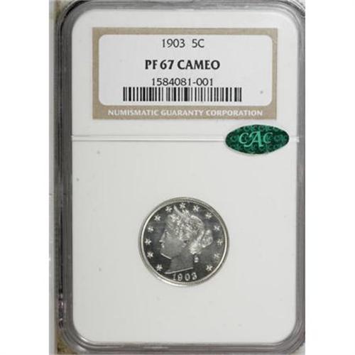 <B>1903 5C PR67 Cameo NGC. CAC.</B></I> Untoned surfaces are deeply cameoed and immaculately preserved, and an impressive strike emboldens the design elements. Great technical quality and aesthetic appeal. Census: 8 in 67 Cameo, 2 finer (1/08).<BR><BR><b>Shipping:</b> Coins & Currency (<a target="_blank" href="http://www.heritageauctions.com/common/shipping.php">view shipping information</a>)