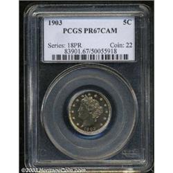 <TABLE cellSpacing=0 cellPadding=0 width="100%" bgColor=#000000 border=0><TBODY><TR><TD width="100%"><TABLE cellSpacing=1 cellPadding=3 width="100%" border=0><TBODY><TR><TD width="100%" bgColor=#79735c><FONT face=arial color=#ffffff size=3><B>Description</B> </FONT></TD></TR><TR><TD width="100%" bgColor=#ffffff><FONT face=arial size=2><B>1903 5C PR67 Cameo PCGS.</B></I> This year marks the first year proof coinage was available after 1901 with any degree of cameo contrast. And the few coins that are available as cameos are not a result of a conscious decision on the part of Mint employees, but purely a coincidence of having been struck from a new pair of dies. This is a modestly contrasted example that probably would show a stronger cameo effect but each side is lightly draped in golden and lilac toning. Population: 2 in 67, 0 finer (8/03). </FONT></TD></TR></TBODY></TABLE></TD></TR></TBODY></TABLE><BR><A name=PricesRealized></A><TABLE cellSpacing=0 cellPadding=0 width="100%" bgColor=#000000 border=0><TBODY><TR><TD width="100%"><TABLE cellSpacing=1 cellPadding=3 width="100%" border=0><TBODY><TR><TD width="100%" bgColor=#79735c><A name=PR><FONT face=arial color=#ffffff size=3><B>Previous Prices from Heritage Auctions</B> </FONT></A></TD></TR><TR><TD bgColor=#f6f6ed><TABLE cellSpacing=0 cellPadding=0 width="100%" border=1><TBODY><TR><TD align=middle width="33%"><B>Date</B></TD><TD align=middle width="33%"><B>Service</B></TD><TD align=middle width="33%"><B>Price</B></TD></TR><TR bgColor=whitesmoke><TD width="33%"><B>03/01/2003</B></TD><TD width="33%">PCGS</TD><TD width="33%">$4,140.00</TD></TR><TR bgColor=whitesmoke><TD width="33%"><B>03/01/2003</B></TD><TD width="33%">PCGS</TD><TD width="33%">$4,140.00</TD></TR></TBODY></TABLE></TD></TR><TR><TD bgColor=#ffffff><FONT face=arial size=1 ?>PLEASE NOTE: All prices realized reflect the final hammer price PLUS the buyer's premium in auctions that charge a buyer's premium. Each item has a notation at the top of the listing indicating whether that lot included a buyer's premium. Example: A item that sells with a final hammer price of $100 and a 20% buyer's premium will display with a price realized of $120. All information listed is intended to be as accurate as possible, but errors are possible. Please use this guide carefully and inform us of any inaccuracies. </FONT></TD></TR></TBODY></TABLE></TD></TR></TBODY></TABLE><BR><TABLE cellSpacing=0 cellPadding=0 width="100%" bgColor=#000000 border=0><TBODY><TR><TD width="100%"><TABLE cellSpacing=1 cellPadding=3 width="100%" border=0><TBODY><TR><TD width="100%" bgColor=#79735c colSpan=6><FONT face=arial color=#ffffff size=3><B>Price Guide*</B> </FONT></TD></TR><TR bgColor=#f6f6ed><TD align=middle><B>Grade</B> </TD><TD align=middle><B>Coin World<BR>(Trends)</B> </TD><TD align=middle><B>Numismedia<BR>Retail</B> </TD><TD align=middle><B>Numismedia<BR>Wholesale</B> </TD><TD align=middle><B>Coin<BR>Universe</B> </TD><TD align=middle><B>Heritage<BR>Value Index</B> </TD></TR><TR bgColor=#ffffff><TD align=middle>66</TD><TD align=right>---</TD><TD align=right>---</TD><TD align=right>---</TD><TD align=right>$1,000.00</TD><TD align=right>$810.00</TD></TR><TR style="FONT-WEIGHT: bold" bgColor=#cccfdd><TD align=middle>67</TD><TD align=right>---</TD><TD align=right>---</TD><TD align=right>---</TD><TD align=right>---</TD><TD align=right>---</TD></TR><TR bgColor=#ffffff><TD align=middle>68</TD><TD align=right>---</TD><TD align=right>---</TD><TD align=right>---</TD><TD align=right>---</TD><TD align=right>---</TD></TR><TR bgColor=#ffffff><TD colSpan=6><FONT size=1>*All information listed is intended to be as accurate as possible, but errors are possible. No item may be returned or refused based on this information which is provided as a service to our customers. You should contact each pricing source directly to determine the accuracy of this information. </FONT></TD></TR></TBODY></TABLE></TD></TR></TBODY></TABLE><BR><TABLE cellSpacing=0 cellPadding=0 width="100%" bgColor=#000000 border=0><TBODY><TR><TD width="100%"><TABLE cellSpacing=1 cellPadding=3 width="100%" border=0><TBODY><TR><TD width="100%" bgColor=#79735c><FONT face=arial color=#ffffff size=3><B>Population Guide</B> </FONT></TD></TR><TR bgColor=#ffffff><TD align=middle><!-- Begin Output of Population Grid--><TABLE cellSpacing=0 cellPadding=0 width="100%" border=0><TBODY><TR><TD vAlign=center><TABLE cellSpacing=0 width="100%" border=1 cellsadding="3"><TBODY><TR><TD vAlign=center><TABLE cellSpacing=0 cellPadding=3 width="100%" border=1><TBODY><TR><TD vAlign=center align=middle bgColor=#f0f1e8 colSpan=2 <CENTER><FONT face=Arial size=2><B>PCGS Pop </B></FONT><CENTER></CENTER></TD><TD vAlign=center align=middle bgColor=#f0f1e8 colSpan=2><CENTER><FONT face=Arial size=2><B>NGC Pop</B></CENTER></FONT></TD></TR><TR><TD vAlign=center><FONT face=Arial size=2>(67)</FONT> </TD><TD vAlign=center align=right><FONT face=Arial size=2>2</FONT> </TD><TD vAlign=center><FONT face=Arial size=2>(67)</FONT> </TD><TD vAlign=center align=right><FONT face=Arial size=2>2</FONT> </TD></TR><TR><TD vAlign=center><FONT face=Arial size=2>(>67)</FONT> </TD><TD vAlign=center align=right><FONT face=Arial size=2>0</FONT> </TD><TD vAlign=center><FONT face=Arial size=2>(>67)</FONT> </TD><TD vAlign=center align=right><FONT face=Arial size=2>2</FONT> </TD></TR></TBODY></TABLE></TD></TR></TBODY></TABLE></TD></TR></TBODY></TABLE><!-- End Output of Population Grid--> Important notice: Heritage usually auctions material at the rate of 200-250 lots per hour. On some occasions eBay Live bid software or the Internet may not be able to keep up with the pace of the auction. We recommend placing a realistic absentee bid now as insurance to avoid disappointment. Occasionally the auctioneer may eliminate or reject an eBay Live bid, and the auctioneer may also reopen a lot after the close of the eBay live bidding (usually because we missed an audience bid), and may reject your bid even if it shows you as the winni