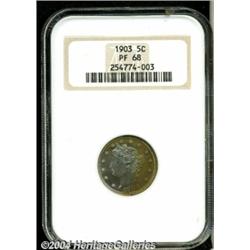 <B>1903<5C> PR68 NGC.</B></I> Exceptionally well struck, with crescents of lime-green, pink, and orange toning covering the right sides of both the obverse and the reverse. The surfaces are lovingly preserved. A few small flecks are conveniently concealed with the toned portions of the coin. Population: 5 in 68, 0 finer (7/04). <BR><BR><B>Important notice:</B> Heritage usually auctions material at the rate of 200-250 lots per hour. On some occasions eBay Live bid software or the Internet may not be able to keep up with the pace of the auction. We recommend placing a realistic absentee bid now as insurance to avoid disappointment. Occasionally the auctioneer may eliminate or reject an eBay Live bid, and the auctioneer may also reopen a lot after the close of the eBay live bidding (usually because we missed an audience bid), and may reject your bid even if it shows you as the winning bidder. By bidding via eBay Live, you agree that Heritage may award the lot to another bidder at its sole discretion under the circumstances described above or any other reasonable circumstances. Since eBay bids are not shown to us until we open the lot on the floor, we treat those bids just like floor bids. In most cases the floor responds before the eBay bid is presented to us, due to Internet lag time, so for consistency we have made it a policy that floor bids are always considered first over tie eBay live bids. Also please note that all Heritage lots purchased through eBay Live carry a 20% Buyer's Premium. Please make sure you read the Terms and Conditions before you bid. </span></font></tr></table></td></tr></table>