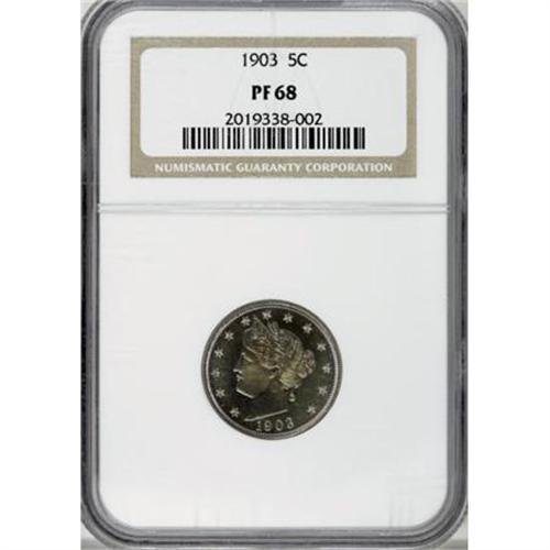 <B>1903 5C PR68 NGC.</B></I> Enticing patina graces the gleaming surfaces of this Liberty nickel proof, flawless to the unaided eye. On the obverse, the watery fields have delightful blue-green patina that surrounds the canary-gold of the portrait, while the thinner reverse patina shows a more even blend of the two hues. A top-notch survivor from this issue of only 1,790 specimens. Census: 5 in 68, 0 finer (8/07).<BR><BR><B>Coin Engraver:</B> Charles E. Barber<BR><BR><b>Shipping:</b> Coins & Currency (<a target="_blank" href="http://www.heritageauctions.com/common/shipping.php">view shipping information</a>)