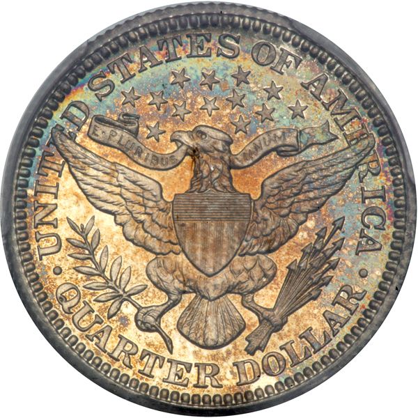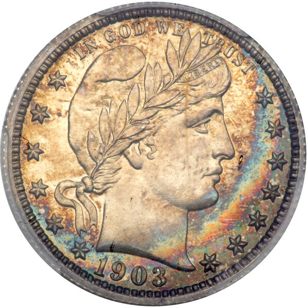1903 Barber Quarter Dollar. PCGS graded Proof 65 PQ CAC Approved. Lovely rainbow toning. Both sides display the typical "look" for this P-mint Proof delivery: mirror-deep reflective surfaces, flashy effects, and boldly struck devices. As we see it, when it comes to the centers of Liberty and the eagle, the strike is needle-sharp, and well defined in all areas. Only 755 Proofs struck (PCGS # 5689) .