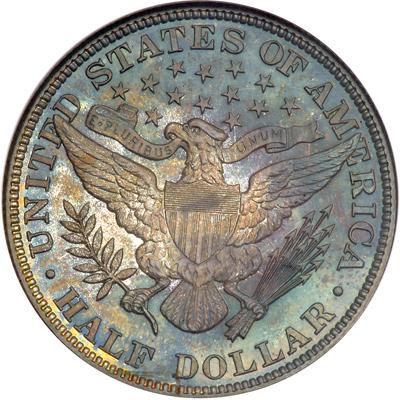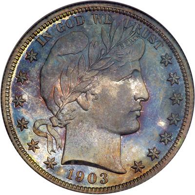 1903 Barber Half Dollar. NGC graded Proof 67. Nice blue and golden toning. Only 755 Proofs issued. We have only handled a few other Proof 1907 Barber half dollars graded as high as this lovely Superb Gem. The coin is spectacular from both technical or aesthetic viewpoints. A hint of silvery brilliance shines through the deeply toned surface, with toning iridescence at the peripheries, across the devices, and throughout the fields. There is a little bit of light frosting over the reverse eagle, but the balance of the features are brilliant in finish with particularly vibrant mirrored reflectivity in the fields. Type collectors who will settle for only the best would be shrewd to take full advantage of the opportunity that this coin presents (along with the others in the group), especially since both major grading services combined report very few high-end Proof Barber half dollars. Pop 18; 3 finer in 68.