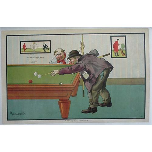 We are offering this superb billiard advertising lithograph, titled "A Difficult Position" by Bernhard Wall for Schwarzman Bros., Albany, NY Maunfacturers of Billiard Pool Tables, Bowling Alleys. It has a copyright date of 1903 J. Moovers & Sons. It measures 17 1/8" X 11, is mounted on acid free backing and is in excellent condition.