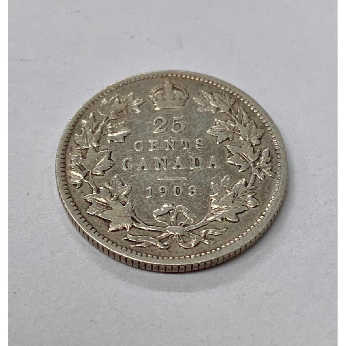 Obverse The portrait in right profile of Edward VII is surrounded with the inscription "EDWARDVS VII DEI GRATIA REX IMPERATOR" (Edward VII, King and Emperor by the grace of God) 1902-1907: ↑↓ 1908-1910: ↑↑ Lettering: EDWARDVS VII DEI GRATIA REX IMPERATOR Reverse The facial value, accompanied with the inscription "CANADA", is surrounded with two maple boughs and a crown. From 1908 to 1910, the boughs were wider. Lettering: 25 CENTS CANADA 1906 Alloy: 92.5% silver, 7.5% copper