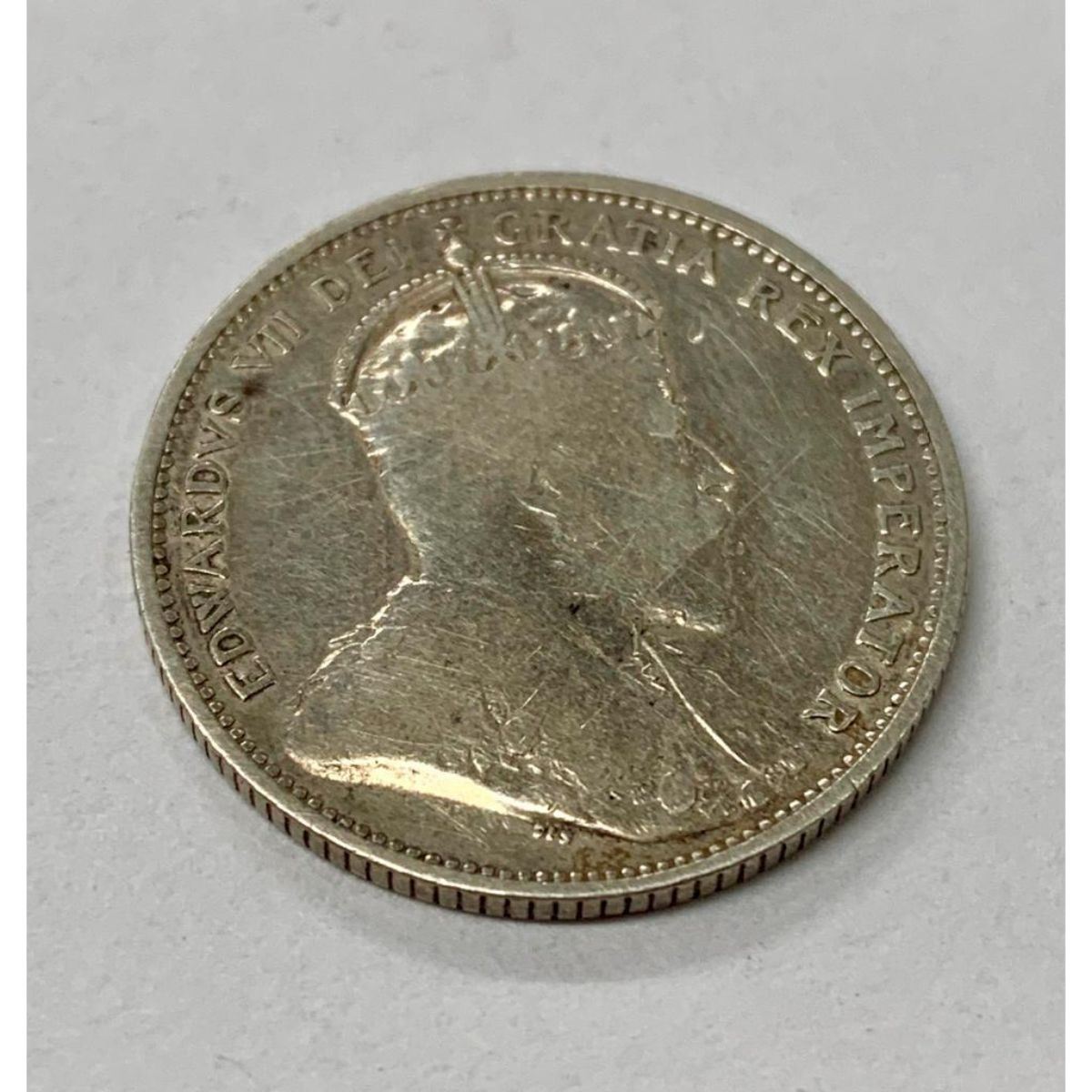 Obverse The portrait in right profile of Edward VII is surrounded with the inscription "EDWARDVS VII DEI GRATIA REX IMPERATOR" (Edward VII, King and Emperor by the grace of God) 1902-1907: ↑↓ 1908-1910: ↑↑ Lettering: EDWARDVS VII DEI GRATIA REX IMPERATOR Reverse The facial value, accompanied with the inscription "CANADA", is surrounded with two maple boughs and a crown. From 1908 to 1910, the boughs were wider. Lettering: 25 CENTS CANADA 1906 Alloy: 92.5% silver, 7.5% copper