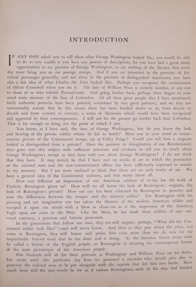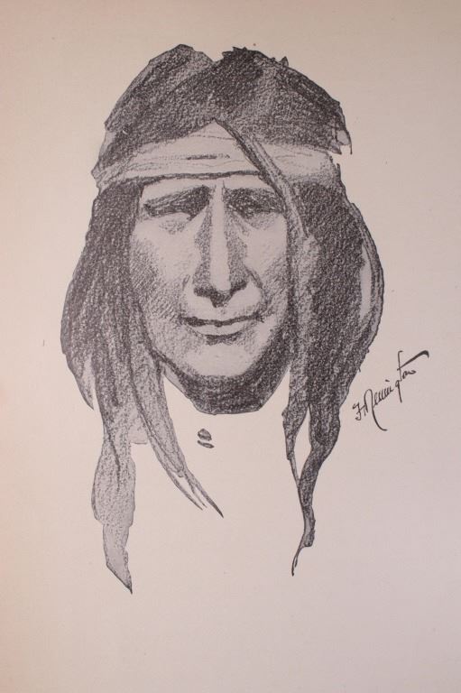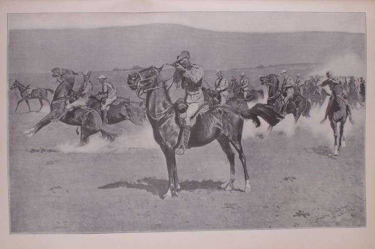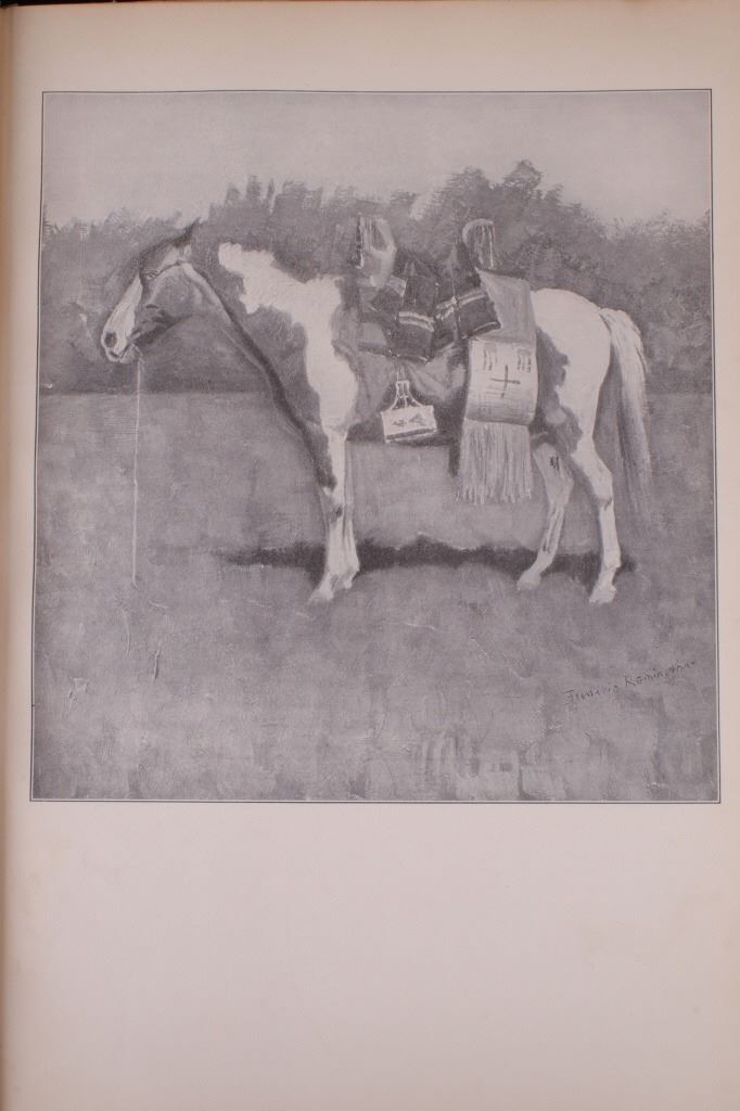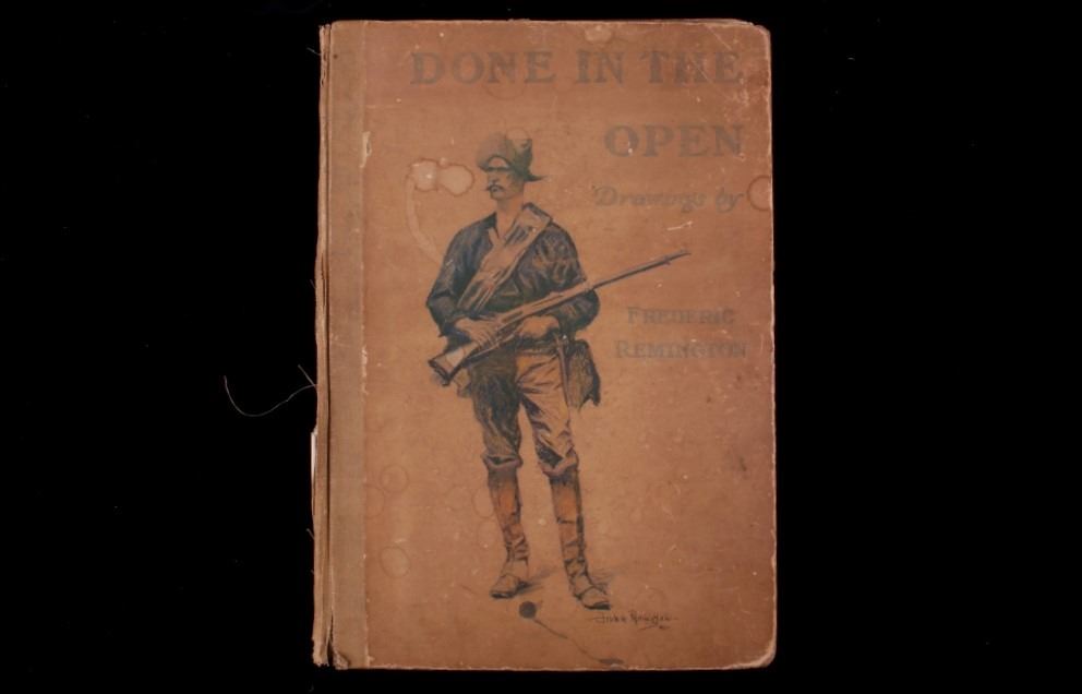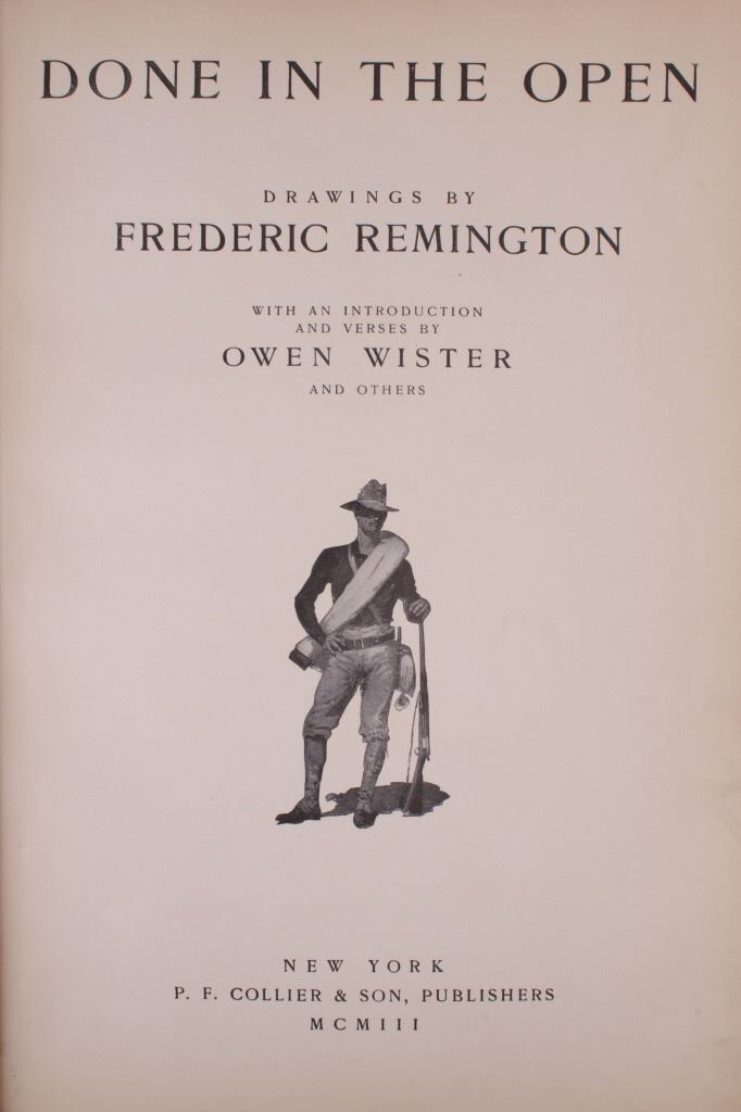 Included in this lot is a copy of "Done in the Open". The drawings in the book are by Frederic Remington and the introduction and verses are by Owen Wister. The book originates from 1903 and is copyright by Robert Howard Russell. The book contains 72 Frederic Remington art pieces, a few of which are in color. The piece shows 12 double page drawings, 28 full page drawings, and 32 smaller drawings. Each of the drawings is accompanied by the art’s title and a verse or poem about the piece. The book has a hard cover and shows the image of a soldier with a rifle; it is marked "Done in the open Drawings by Frederic Remington" in blue lettering. The book shows good condition for its age and has some medium wear. The piece measures 11 1/2" wide by 16 1/2" tall.