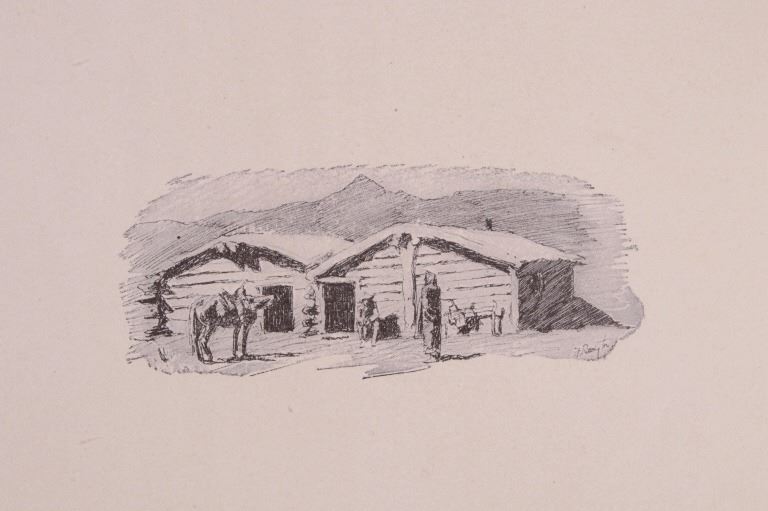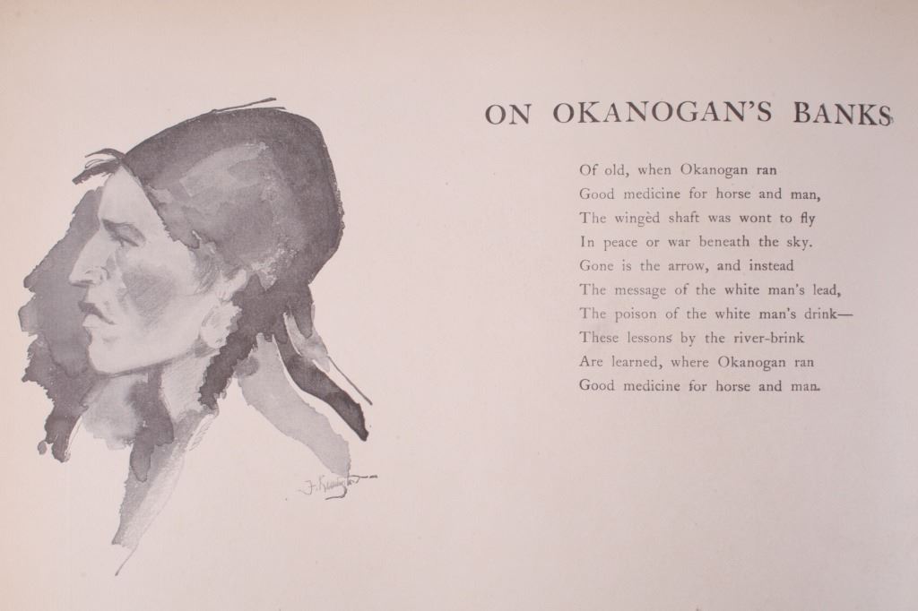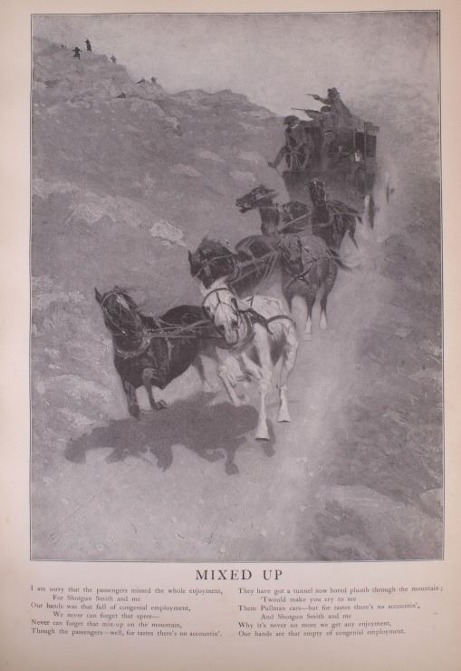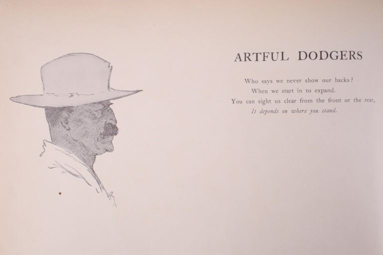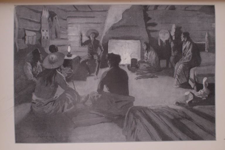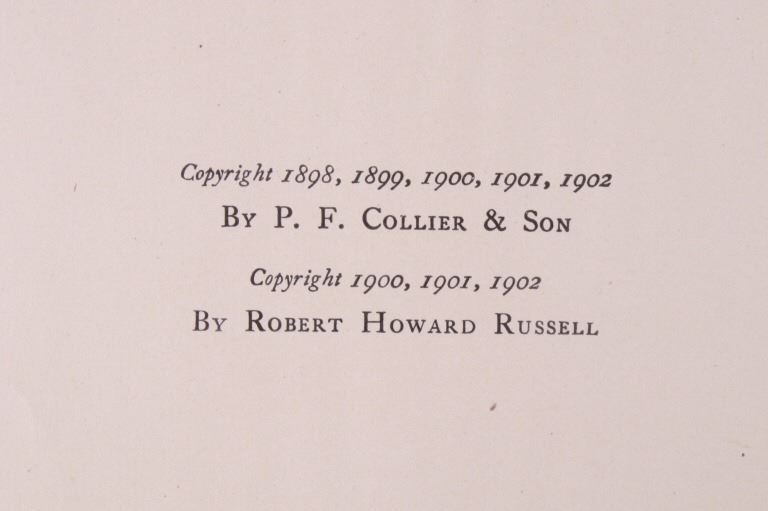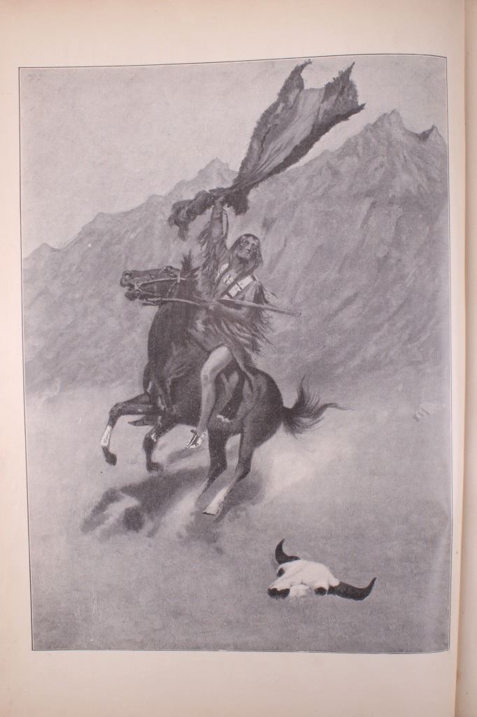 Included in this lot is a copy of "Done in the Open". The drawings in the book are by Frederic Remington and the introduction and verses are by Owen Wister. The book originates from 1903 and is copyright by Robert Howard Russell. The book contains 72 Frederic Remington art pieces, a few of which are in color. The piece shows 12 double page drawings, 28 full page drawings, and 32 smaller drawings. Each of the drawings is accompanied by the art’s title and a verse or poem about the piece. The book has a hard cover and shows the image of a soldier with a rifle; it is marked "Done in the open Drawings by Frederic Remington" in blue lettering. The book shows good condition for its age and has some medium wear. The piece measures 11 1/2" wide by 16 1/2" tall.