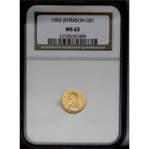 <B>1903<G$1> Louisiana Purchase/Jefferson MS62 NGC.</B></I> A lustrous example with orange and green accents on the yellow-gold surfaces. Some marks appear on the nicely struck devices.