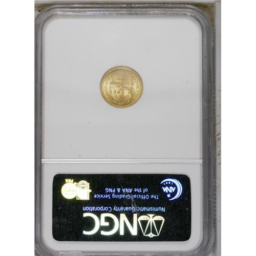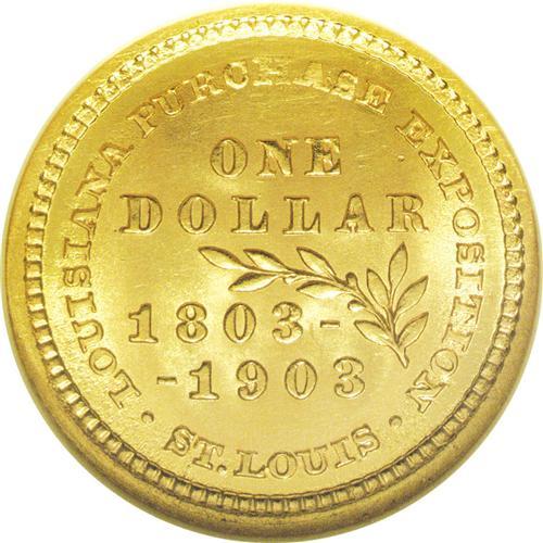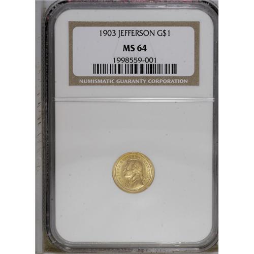 <B>1903<G$1> Louisiana Purchase/Jefferson MS64 NGC.</B></I> As the president who oversaw the Louisiana Purchase, Jefferson was a logical choice for the obverse of this classic commemorative. (The other president, McKinley, was the most recent of the assassinated presidents, and his death still resonated with the public.) On this representative, the highly lustrous surfaces have elements of lemon-yellow and straw-gold. It is boldly detailed, though minor flaws behind Jefferson's head preclude a higher grade.