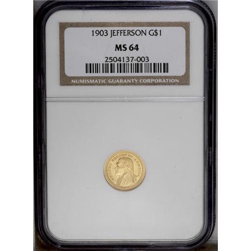 <B>1903 G$1 Louisiana Purchase/Jefferson MS64 NGC.</B></I> Bright yellow-gold surfaces yield a satiny appearance and are devoid of mentionable abrasions. The design elements are sharply struck, except for weakness in the letters HA of PURCHASE.