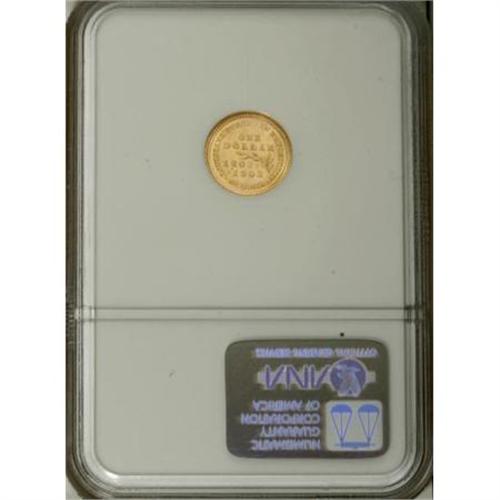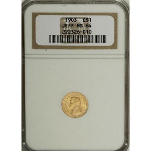 <B>1903 G$1 Louisiana Purchase/Jefferson MS64 NGC.</B></I> Frosty luster enlivens the brass-gold surfaces. Well struck throughout. A light spot is visible on the lower left reverse.<BR><BR><b>Shipping:</b> Coins & Currency (<a target="_blank" href="http://www.heritageauctions.com/common/shipping.php">view shipping information</a>)